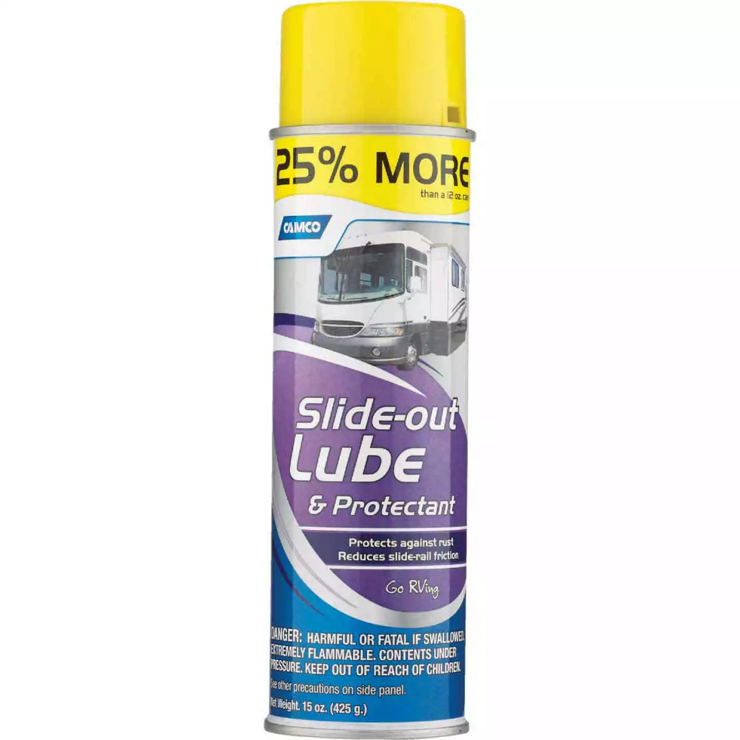 Make slide outs operate smoothly without sticking. Spray on lube leaves a dry film that repels dirt and grime and protects against rust and corrosion. 15 oz aerosol.