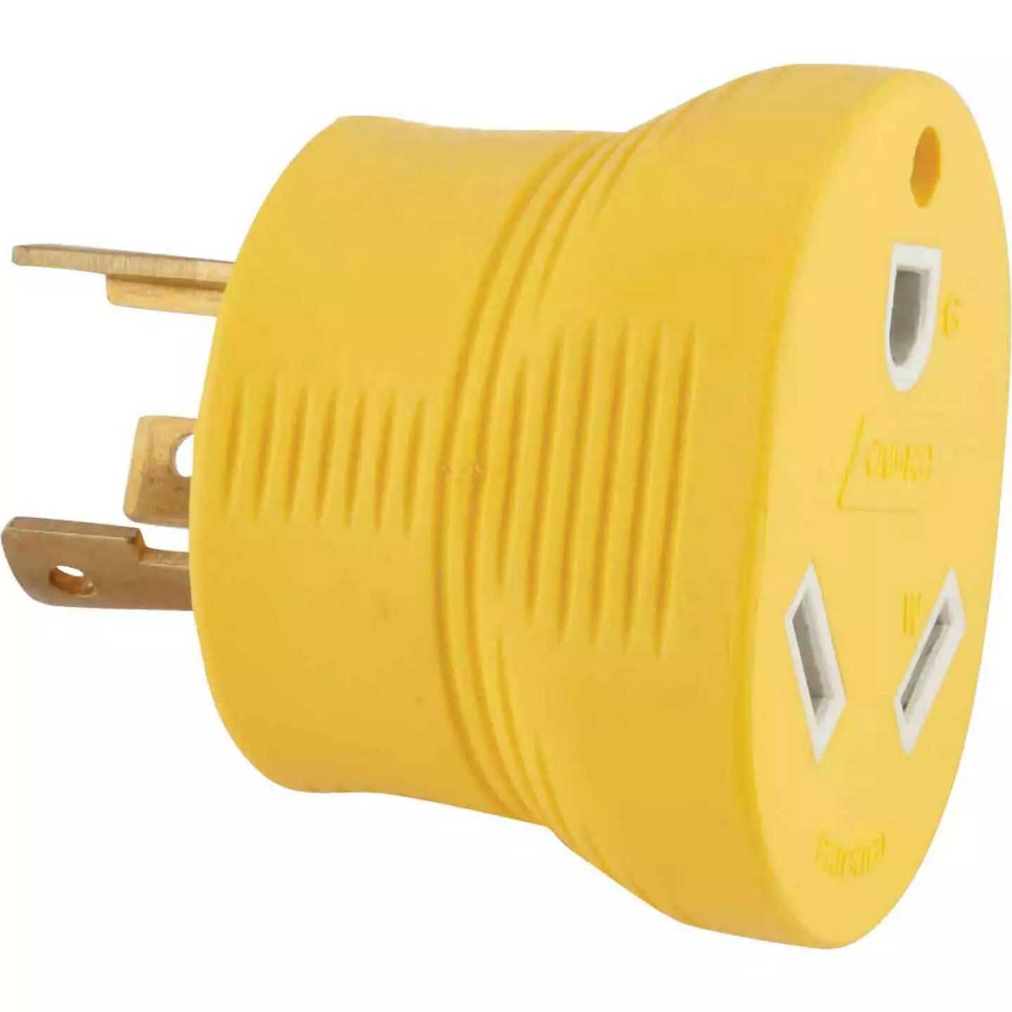 Power Grip generator adapter for connecting a generator with a L5-30 (3-prong) or L14-30 (4-prong) locking plug receptacle to a recreational vehicle that uses a standard RV cord set (TT-30) to connect to 120V AC short power. Comfort-grip with nonslip grooves. 1-piece heavy-duty construction.