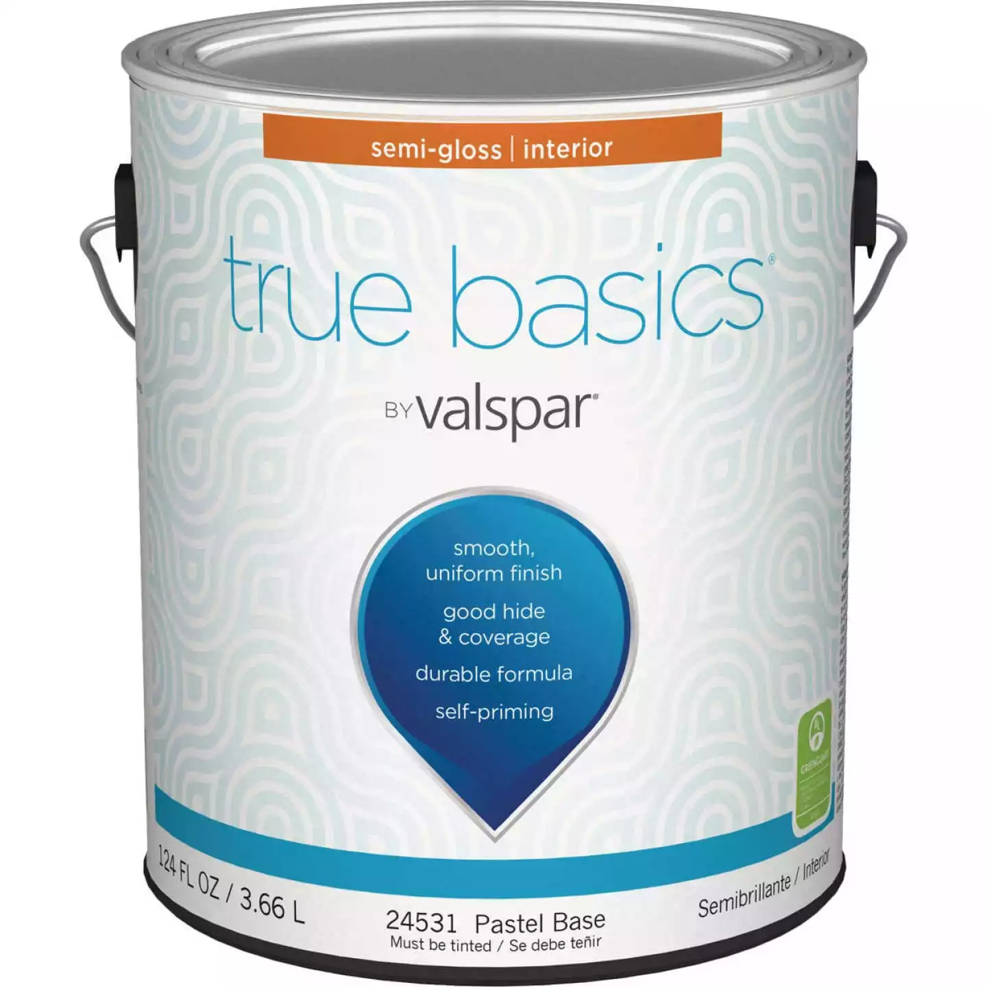 True Basics by Valspar is a self-priming paint that delivers smooth performance while providing lasting durability. It has good coverage, hides imperfections, offers great touchup, and cleans up with soap and water. This paint is ideal for residential re-paint and new home construction – formulated for spray, brush and roll application on properly prepared interior walls and ceilings including previously painted and primed plaster, wood, brick, drywall, cement, and metal.